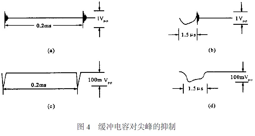 在開關(guān)三極管的CE之間,或者在續(xù)流二極管的兩端并聯(lián)RC緩沖電路可使尖峰干擾明顯減小。圖3中,三極管T關(guān)斷時(shí),集電極電壓上升,通過(guò)D和R1對(duì)C充電,使其上升速率變緩,選擇充電常數(shù)CR1的值可以控制上升速率。T導(dǎo)通時(shí),D截止,C對(duì)R1和R2放電,限制了導(dǎo)通瞬間的峰值電流。該緩沖電路改變了負(fù)載線的形狀,減少了開關(guān)三極管的損耗。在續(xù)流二極管兩端并上RC電路也同樣有效。圖3中,當(dāng)用3DD11和2CK120C時(shí),可并0.022LF左右的電容器(f=2kHz),該電容的容量有一最佳值,它的作用可以從圖4看出。圖4(a)是不加C的情況,將其在時(shí)間軸上放大后為圖4(b)。并上緩沖電容后分別見(jiàn)圖4(c)和(d)。