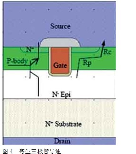 寄生三極管導通損壞:在MOSFET內部,有一個寄生的三極管(見圖4),通常三級管的擊穿電壓通常低于MOSFET的電壓。當DS的反向電流開始流過P區后,Rp和Rc產生壓降,Rp和Rc的壓降等于三極管BJT的VBEon。由于局部單元的不一致,那些弱的單元,由于基級電流IB增加和三級管的放大作用促使局部的三極管BJT導通,從而導致失控發生。此時,柵極的電壓不再能夠關斷MOSFET。