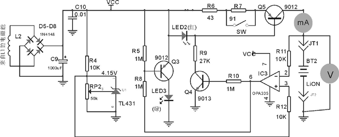 由R4,RP2和TL431構(gòu)成精密參考電壓4.15V(鋰離子電池的充電終止電壓)經(jīng)R12接到運(yùn)放IC的同相輸入端3。當(dāng)IC2的反相輸入端2低于4.15V時(充電過程中),IC3輸出的高電位一方面使Q4飽和從而在LED2兩端得到約2V的穩(wěn)定電壓(LED的正向?qū)ň哂蟹€(wěn)壓特性),Q5與R6、R7便據(jù)此構(gòu)成恒流電路I0=2-0.7R6+R7。另一方面R5使Q3截止,LED3不亮。