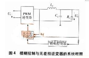 將輸出電壓和濾波電感電流反饋,即電壓誤差和電感電流作為輸入模糊變量,可以實現(xiàn)逆變器的模糊控制,整流性負載時,其輸出電壓總諧波失真(total harmonic distortion,TH)小于5%,將模糊控制與無差拍控制相結合,可用來補償由于非線性負載導致的電壓降落,其系統(tǒng)如圖4所示。模糊控制從模仿人的思維外特性入手,模仿人的模糊信息處理能力。它對系統(tǒng)的控制是以人的經(jīng)驗為依據(jù)的,而人的經(jīng)驗正是反映人在思維過程中的判斷、推理、歸納。理論上已經(jīng)證明,模糊控制可以任意精度逼近任何線性函數(shù),但受到當前技術水平的限制,模糊變量的分檔和模糊規(guī)則都受到一定的限制,隸屬函數(shù)的確定還沒有統(tǒng)一的理論指導,帶有一定的人為因素,因此,模糊控制的精度有待于進一步提高。