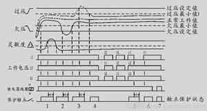 如工作電壓超出其欠壓設定值時,吸合工作觸點進入所設定的延時保護狀態(設定時間為0~30s)。待延時結束后,控制器工作觸點釋放,由接通狀態變至斷開狀態,直至電壓重新回至正常電壓工作帶。在工作時序圖中,保護觸點狀態2、3即為欠壓保護工作狀態。