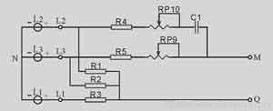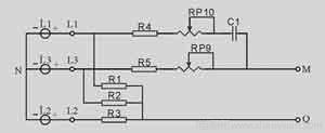 在保護器電源輸入端⑤、⑥、⑦串接相應的RC移相電路(R4、RP9、C11、RP10、R5、R3)。調整相應電位器RP9、RP10,使加至整流橋輸入端M、Q的電壓為確定值(在保護器工作電源處于額定電壓下進行調整)。如工作電壓有波動,則由相應RC移相電路使整流橋電壓輸入端電壓發生變化,從而使IC3A②端電壓Vcc也發生變化。在取樣電路中加入V1穩壓管,則保證電壓檢測值不得超過V1穩壓值。如超出,則IC3A中V③<V②,輸出①端為“0”,并使IC3B⑤端電平為“0”(C6經R28放電,電平下降);同時,IC3B輸入端V⑤<V⑥(V⑥電平由R24、R23分壓取得),輸出端⑦亦為“0”,使IC2⑥端電平為“0”,產品處于保護狀態。