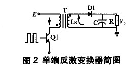 功率轉換部分采用單端反激電路,結構如圖2。當加到原邊主功率開關管Q1的激勵脈沖為高電平使Q1導通時,直流輸入電壓加在原邊繞組兩端,由于此時副邊繞組相位是上負下正,整流管D1反向偏置截止,原邊電感儲存能量;當激勵脈沖為低電平使Q1截止時,原邊繞組兩端電壓極性反向,副邊繞組相位變?yōu)樯险仑摚鞴苷蚱脤ǎ儔浩鲀Υ娴哪芰肯蚋边呩尫拧T诖碎_關過程中,高頻變壓器既起變壓隔離作用,又起電感儲能作用。