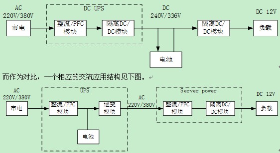 在UPS應用的另外一個分支是目前正在興起的直流UPS系統。直流系統的思路是出于提高效率的目的,減少電源系統中間的轉換環節,電力分配部分由原來的交流轉換成直流。一個理想的直流UPS系統服務器應用從市電到12V終端的應用結構見下圖。