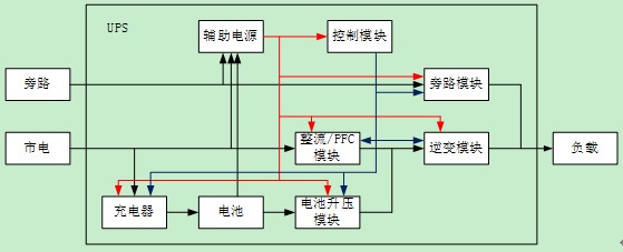 對于負載端來說,能夠直接相連的只有旁路模塊與逆變模塊,而這兩個模塊是并聯的;