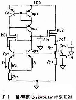 但是,由于本設(shè)計采用LDO供電,而LDO的參考電壓是bg,存在死循環(huán),即bg低,則LDO低,所以基準(zhǔn)核心的VQC5無法給VQCS2提供電流,也就無法提高VQC2的電壓即bg,因此需要外界提供大電流bias-start,使得當(dāng)LDO無法啟動基準(zhǔn)核心時,此電流可以足夠大,在RC4上產(chǎn)生的壓降使bg達(dá)到足夠大,繼而LDO達(dá)到使基準(zhǔn)核心啟動所需的最低電壓,從而使電路進入自動修正狀態(tài),最終使bg和ref達(dá)到指定電壓。
