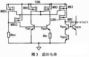 這樣雖然能啟動,但是,正常工作時,此大啟動電流bias-start將通過VQCS1和VQCS3流向地,增加了系統(tǒng)的負(fù)擔(dān)。因此,在電流輸出管MB3下加入控制管MBC,并使得在正常工作時,LDO的高電壓足以使MBC關(guān)斷,從而降低啟動電路的損耗。