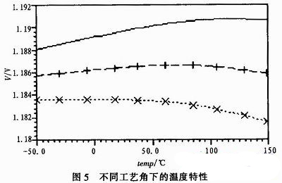 圖5為不同工藝角下的溫漂仿真。仿真結(jié)果表明,此電路可以達(dá)到ref-45 ppm、bg-7.5 ppm的低溫漂。實際電路存在器件的不匹配和誤差等,雖然達(dá)不到理論上的溫漂,但通過仔細(xì)布版、修調(diào)帶隙核心電路中Rc1、Rc2,可以達(dá)到較低的溫漂。
