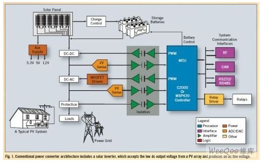 電源逆變器是太陽能發(fā)電系統(tǒng)的關(guān)鍵電子組件。在商業(yè)應用中,這些組件連接光伏(PV)面板、儲存電能的電池以及本地電力分配系統(tǒng)或公用事業(yè)電網(wǎng)。圖1顯示的是一個典型的太陽能逆變器,它把來自光伏陣列輸出的極低的直流電壓轉(zhuǎn)換成電池直流電壓、交流線路電壓和配電網(wǎng)電壓等若干種電壓。