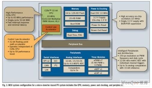 圖3 面向基于微逆變器PV的系統(tǒng)的MCU系統(tǒng)包含CPU、存儲器、電源及時鐘、外設(shè)
