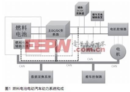 目前,燃料電池電動汽車(FCEV)成為我國汽車科技創(chuàng)新主攻方向。燃料電池電動汽車動力系統(tǒng)主要由燃料電池發(fā)動機,DC/DC變換器,蓄電池,電機控制器(變頻器)及電機,整車控制器,數(shù)據(jù)采集系統(tǒng)及CAN總線組成,如圖1所示。其中DC/DC變換器可以對燃料電池的輸出進行控制及能量的傳遞與轉(zhuǎn)換,成為燃料電池電動汽車關(guān)鍵零部件之一。在燃料電池電動汽車運行過程中,DC/DC變換器所處的電磁環(huán)境十分復(fù)雜,各種形式的電磁干擾很多,嚴重影響了DC/DC變換器的正常運行。因此,研究FCEV用DC/DC變換器的電磁兼容性對DC/DC變換器乃至燃料電池電動汽車的可靠運行具有重要意義。