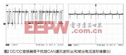 FCEV用DC/DC變換器的功率一般比較大,通常選擇IGBT為功率開關(guān)管。功率開關(guān)管IGBT工作過程中產(chǎn)生高的du/dt和di/dt以及浪涌電流和尖峰電壓[1],這是FCEV用大功率DC/DC變換器產(chǎn)生電磁干擾最根本的原因。另外功率開關(guān)管開通和關(guān)斷瞬間,由于分布電感和分布電容的存在,電感電流容易發(fā)生高頻振蕩,這些因素都會產(chǎn)生強大的電磁干擾,這在FCEV用大功率DC/DC變換器中表現(xiàn)的尤為明顯。這種電磁干擾嚴重影響整車控制器與CAN通信,導(dǎo)致CAN通訊頻繁報錯,無法正常通訊。CAN通訊受干擾后的傳輸波形如圖2(a)所示。從圖中可以明顯看到,變換器開關(guān)噪音疊加在CAN通訊脈沖上,并且幅度很大。此外,嚴重的電磁干擾也會使大功率DC/DC變換器輸出紋波過大,紋波過大直接影響大功率DC/DC變換器的性能[2]。圖2(b)是用示波器采集到的變換器未經(jīng)濾波處理的輸出電壓波形,從圖中可以看到,輸出電壓上疊加了大量的開關(guān)噪音。
