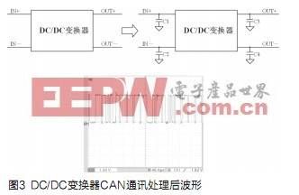 FCEV用大功率DC/DC變換器產(chǎn)生的電磁干擾以傳導(dǎo)干擾為主。目前最常用的方法就是在DC/DC變換器輸入和輸出端加裝濾波電容器。如圖3,為了減小FCEV用大功率DC/DC變換器對CAN通訊的干擾,在變換器輸入輸出端加適量的接地電容,CAN通訊波形得到有效改善。