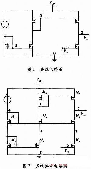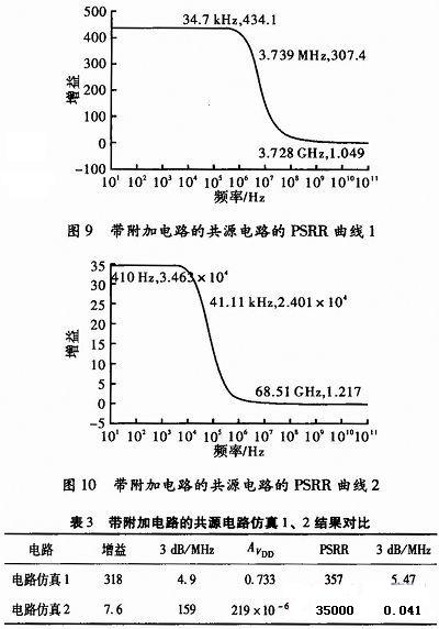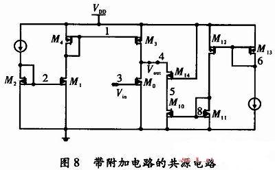 帶附加電路的共源電路如圖7和圖8所示,消除了使用工作以線性范圍內的共源放大器,從VDD到輸出節點電源波動的影響。