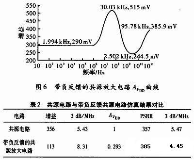 然而,這一電路的3 dB頻率點與使用負反饋技術相比較低,盡管附加的MOSFET增加了輸出節點的負載電容,極點左移而3 dB頻率變低。低增益和高PSRR放大器,能通過級連達到較高的增益。