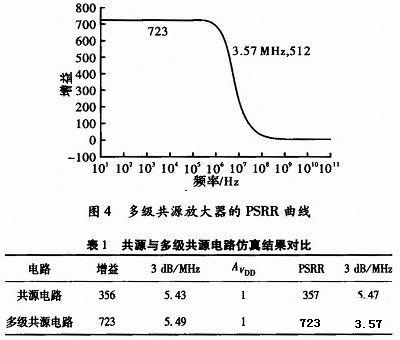 盡管共源共柵技術同比率改善了電路的增益和PSRR,但它卻隨之帶來較低的輸出擺幅和3 dB頻率點及較高的輸出阻抗,且不適于放大器的級聯和較高工作頻率等需求的應用中。負反饋技術在改善放大器PSRR的同時又穩定了輸出。盡管負反饋技術減少了從電源到輸出節點的增益,如AVDD,并且增益了PSRR。但增益是按比例減少,B值能夠被合理的調整以達到增益要求。這一技術對工作在高頻中的電路有效。附加電路則是能夠給出最大PSRR值的技術,其結論能夠從3種技術的仿真數據輸出表里看出,并能維持較高的增益值。但它也有減小電路3 dB頻率點的不足,因為在輸出端引進了附加電容。因此,如表3中的電路2可以看到,這一電路能夠達到極高的PSRR值,卻是以很低的增益為代價。因此,該電路在設計含級聯放大器電路的設計中有重要作用,這里增益可通過級聯解決。附加電路能夠滿足電源波動穩定性的需求。