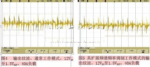頗有爭議的一點是,由于擴展頻譜頻率調制的頻率不斷變化,可能使負載瞬態響應變差。而當20A負載步進時,對輸出進行的負載瞬態測試顯示,擴展頻譜頻率調制根本不影響響應時間。響應波形的時間和峰峰值都類似。