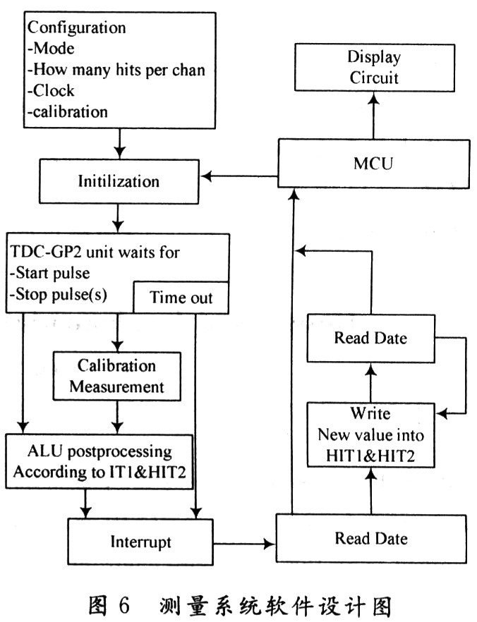 初始化之后,TDC-GP2高速測量單元接收到START脈沖后開始工作,達到設置的采樣數或者遇到測量溢出后才停止工作。軟件設計的重點在于根據需要設置TDC-GP2的工作模式和讀取其內部的測量數據。在測量結尾,ALU開始依照HIT1和HIT2的設置處理數據并把結果送入輸出寄存器。如果不進行校準,ALU傳輸16位原始數據到輸出寄存器;如果進行校準,則ALU傳輸32位的固定浮點數到輸出寄存器。然后通過單片機AT89S52處理后,在液晶顯示器讀取時間間隔數據,其測量流程如圖6所示。