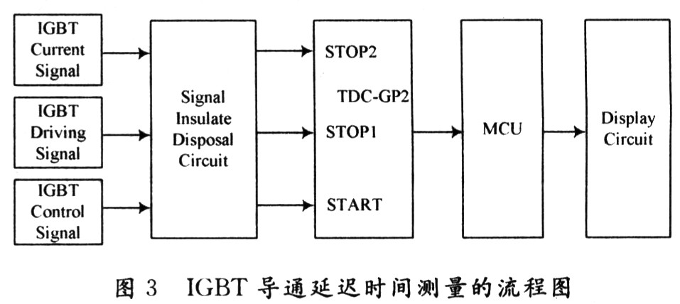 絕緣柵雙極型晶體管(IGBT)是GTR和MOSFET的一種新型復合器件,自問世以來就以輸入阻抗高,開關速度快,通態壓降低,阻斷電壓高,承受電流大等優點成為當今功率半導體器件中的主流開關器件,并廣泛應用于多領域的工程實踐當中。目前,IGBT的導通延遲時間可以達到幾百納秒,甚至更低。但在某些對器件時間特性要求較高的工程應用中,需要更精確地確定IGBT的導通延遲時間。因而高精度的測量時間間隔是測量領域一直關注的問題。本文從精簡結構,同時兼顧精度的角度出發,提出一種基于時間測量芯片TDC-GP2來精確測量IGBT導通延遲時間系統,用于測量IGBT的導通延遲時間,實現簡單且成本低的一種較為理想的測量方案。