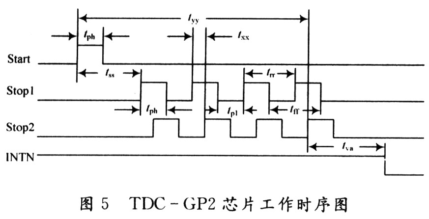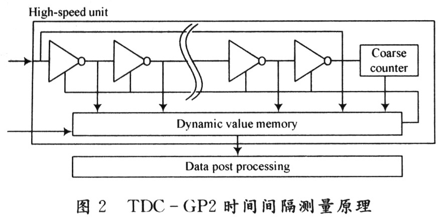 該系統主要由脈沖產生器、數據處理單元、時間數字轉換器、溫度測量單元、時鐘控制單元、配置寄存器以及與單片機相接的SPI接口組成。在實際應用中,由于TDC-GP2的功耗很低,使得TDC-GP2的輸入/輸出電壓(工作電壓)為1.8~5.5 V,核心電壓為1.8~3.6 V,所以可以采用電池供電,使用方便。同時單片機由4線的SPI接口相連,可以把TDC-GP2作為單片機的一個外圍設備來操作。通過內部ALU單元計算出時間間隔,并將結果送入結果寄存器保存起來。通過對TDC-GP2內部寄存器的設置,可以多次采樣并將結果保存。TDC-GP2是基于內部的模擬電路測量“傳輸延時”來進行的,是以信號通過內部門電路的傳播延遲來進行高精度時間間隔測量的。TDC-GP2時間間隔測量原理如圖2所示。