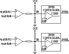 通過檢測RC網(wǎng)絡中C兩端的電壓,作為電流信號,幾路電流信號(本例只有兩路)通過一個相同的電阻就得到了平均值均流母線,平均值均流母線電壓值與負載有關,表征負載電流的大小。然后將每路采樣來的電流信號與母線電壓比較,得到誤差信號,去修正輸出電壓參考信號,從而對PWM控制器的占空比輸出進行微調(diào),達到均流和穩(wěn)壓的目的。