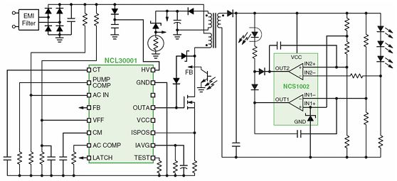 NCL30001是一種單段拓撲結構LED驅動方案,其靈活的特性非常適合應用于新的LED照明產品,其他規格特性還包括高壓啟動電路、電壓前饋以改善環路響應、輸入欠壓檢測、內部過載定時器、閂鎖輸入,以及減少輸入線路諧波的高精度乘法器。這種方案采用連續導電模式(CCM)工作,集成了PFC和隔離型DC-DC轉換電路,并提供恒定電流來直接驅動LED,相當于將AC-DC轉換與LED驅動兩部分電路整合在一起,均位于照明燈具內,省去了LED光條中集成的線性或DC-DC轉換器。這種整體式方案的電源轉換段更少,減少元器件使用數量(如光學元件、LED、電子元件及印制電路板等),降低系統成本,并支持更高的LED電源總體能效。當然,這種方案的功率密度更高,可能并不適合所有區域照明應用,其光學圖案可能更適合較低功率的LED,典型應用包括LED街燈、外墻燈、洗墻燈及電冰箱箱體照明等。