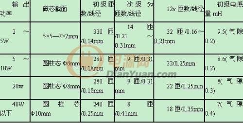 制作RCC型電源關鍵是脈沖變壓器T的繞制。無論何種開關電源脈沖變壓器的計算是極繁瑣又極不準確的,對業余制作者來說通過估算,實驗調整來確定比較實際。即使是估算也涉及磁芯材料,結構的影響,限于目前市場產品參數的離散性,業余者也難以確定,此處只列出部分計算結果供參考。小功率開關電源脈沖變壓器制作參數(繞組功能參考附圖)如附表所示。