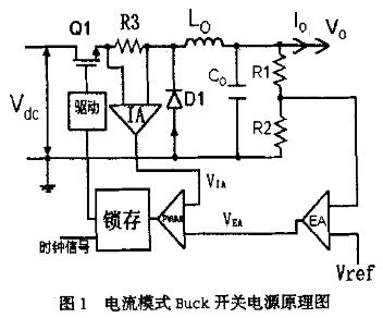 開關電源可以有很多種結構,但原理基本相似。圖1是電流模式降壓斬波fg(Buck)開關電源的原理圖。它和電壓模式的主要區別是增加了電流采樣電阻R3和電流放大器IA. R3的阻值一般很小,以避免大的功耗。功率管Ql在每個周期開始的時候開啟并維持一段時間Ton,通過濾波電感Lo對濾波電容C。充電、同時向負載提供電流,此時Lo上電流隨時間的變化率為