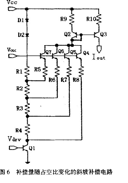 因為 Q4 ,Q5,Q 6和Q7是先后開啟的,所以補償電流在時間軸上的斜率dlout/dt將隨著Vosc的增大而增大,即斜坡補償的量隨占空比增大而增大。