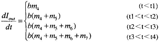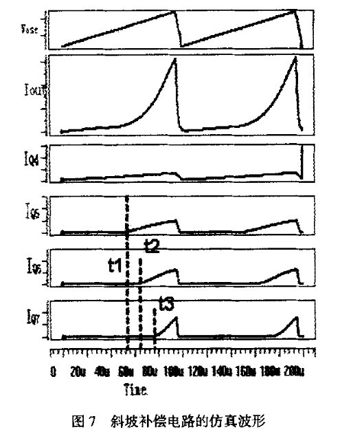 圖7是在選取了元件尺寸后計算機仿真波形。其中Vosc是理想化的鋸齒波,Iout是輸出的補償電流,IQ4、IQ5、IQ6、 IQ7分別是Q4, Q5, Q6和Q7的漏極電流,可以看到,為了在占空比小于50%的時候系統更加穩定,Q4在每個周期開始時就已經開啟,但是電流的斜率較小。隨著Vosc以恒定的斜率上升,將先后在t1, t2, t3時達到Q5, Q6和07的開啟點。設Q4, Q5, Q6, Q7開啟后的電流斜率分別為m4, m5, m6和m7,