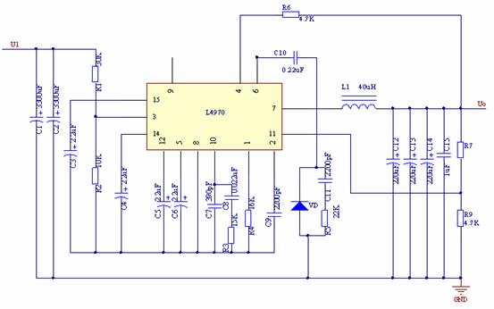 L4970A芯片的輸出電壓設(shè)定為10.8V,其輸出電阻R7由下式確定:,其中R9=4.7K,令Uo=10.8V,則R7=5.25K,取標(biāo)稱值5.1K。