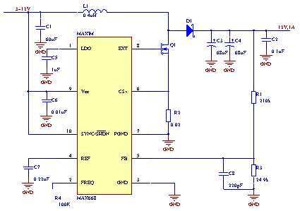 我們采用MAXIM公司的升壓型dc/dc芯片MAX668。MAX668具有很寬的輸入輸出電壓范圍,它可以將3~12V的輸入電壓升高到12V輸出,同時(shí),由于其采用了低至100mV的電流檢測電壓和MAXIM公司特有的空閑模式,轉(zhuǎn)換效率高達(dá)90%以上,具有最高1A的電流輸出能力,升壓電路如圖6所示。