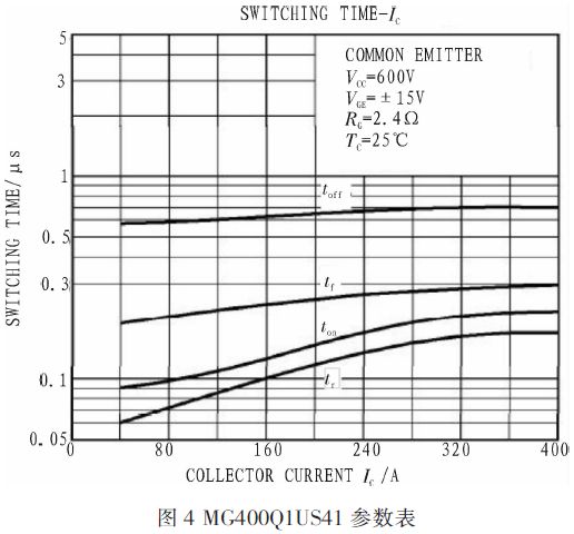 功率開關管IGBT采用高速型MG400Q1US41,其參數為1 200V/400A,其參數如圖4所示。工程中采用十管串聯的方法以適應高電壓的要求。驅動模塊采用M57962L,其參數為1 200 V/400 A。