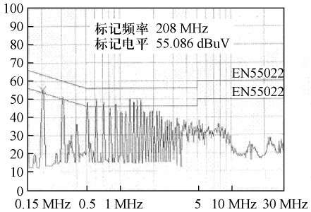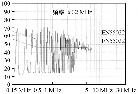 根據圖3 所示的結構。繞制變壓器,并在交流整流濾波后增設13 mH 差模濾波電感和6. 8差模濾波電容,對開關電源進行傳導EMI 測試,結果如圖6 所示。由圖6 可見,傳導EMI 非常嚴重,不能通過電磁干擾測試。在交流整流前增設35 mH 共模濾波電感,傳導EMI 測試結果如圖7 所示,產品即可通過測試。比較測試結果可得出:在圖3 所示的電路中,主要是由于大量共模傳導EMI,才使電源不能通過電磁干擾測試。
