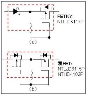 而在另一方面,通過用具有低V CE(Sat)的晶體管或者具有低Rds(on)的MOSFET代替肖特基二極管,可以降低傳輸元件上的壓降,從而符合所需要的有限電壓裕量要求。例如,雙FET用作充電功率元件(如圖3(b)所示)就是一個更加合適的選擇。在這方面,安森美半導體的NTLJD3115P和NTHD4102P就是非常適合的選擇。其中,NTLJD3115P是一款-20 V、-4.1 A、μCool? 雙P溝道功率MOSFET,它采用2×2 mm的WDFN封裝,具有極低的導通阻抗,其0.8 mm的高度也使其非常適合纖薄的應用環境;它針對便攜設備中的電池和負載管理應用進行了優化,適合于鋰離子電池充電和保護電路應用及高端負載開關應用。而 NTHD4102P是一款-20 V、-4.1 A雙P溝道ChipFETTM功率MOSFET,同樣具有較小的占位面積和極低的導通阻抗,適合于纖薄的便攜應用環境。