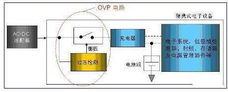 根據YD/T 1591-2006標準,手機側充電控制電路應具備過壓保護裝置,也就是在手機充電接口導入直流6 V以上電壓時,如果不能保證安全充電,應啟動保護,在非預期電壓的情況下,不應出現過熱、燃燒、爆炸以及其它電路損壞的現象,而且恢復后,手機應能正常工作。如圖4所示,過壓保護(OVP)電路在檢測到過壓故障狀況時,檢測電路就會將開關打開,使電子負載與電源斷開,從而使得包括微處理器、射頻、存儲器和電源管理器件等核心芯片遭受過壓損傷。