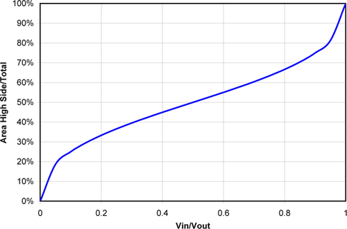 通過圖1,我們知道 50% 轉換比率時出現最佳傳導損耗極值。但是,在其他轉換比率條件下,可以將損耗降至這一水平以下。附錄 1 給出了進行這種優化的數學計算方法,而圖 2 顯示了其計算結果。即使在極低的轉換比率條件下,FET 芯片面積的很大一部分都應該用于高側 FET。高轉換比率時同樣如此;應該有很大一部分面積用于低側。這些結果是對這一問題的初步研究,其并未包括如高側和低側FET之間的各種具體電阻值,開關速度的影響,或者對這種芯片面積進行封裝相關的成本和電阻等諸多方面。但是,它為確定 FET 之間的電阻比提供了一個良好的開端,并且應會在FET選擇方面實現更好的整體折中。