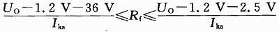 UC3845的1腳正常電壓為0.8 V~6.2 V,由PC817的技術(shù)資料得:當(dāng)PC817二極管正向電流If為3 mA左右時,晶體管集射電流Ic在4 mA左右變化,集射電壓Uce在很寬的范圍內(nèi)線性變化,符合UC3845的控制要求,所以取PC817二極管正向電流If為3 mA,取TL431a陰極電流Ika為不大于150 mA的確定值(例如20 mA)。由此根據(jù),可得Rbias的值;又由TL431a陰極工作電位為2.5~36 V得到Rf的取值范圍: