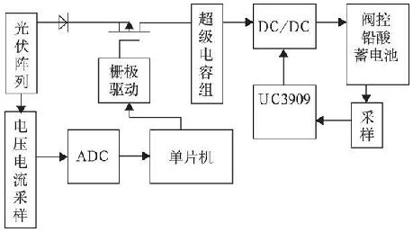 圖2 所示為基于U C3909 太陽能蓄電池充電器電路框圖, 光伏陣列經過電壓電流采樣再經模數轉換將數字信號反饋至單片機, 單片機根據光伏陣列的工作狀況輸出PWM 信號去驅動PMOS 管, 實現對光伏陣列的最大功率跟蹤。超級電容器組、DC/ DC 變換器、UC3909 用來實現對閥控鉛酸蓄電池的四階段充電控制, 并利用超級電容的特性優化充放電過程。本文側重對超級電容器組、U C3909 及DC/ DC 變換器等部分實現對閥控鉛酸蓄電池四階段的充電分析及設計。