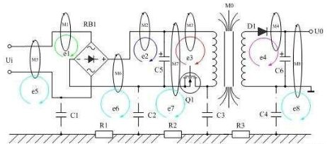 圖1是磁感應產生傳導干擾的原理圖,圖1表示開關電源變壓器產生的漏磁通穿過其它電路時,在其它電路中也產生感應電動勢,其中漏磁通M1、M2、M3產生的感應電動勢e1、e2、e3屬于是差模干擾信號;M5、M6、M7、M8產生的感應電動勢e5、e6、e7、e8屬于是共模干擾信號。