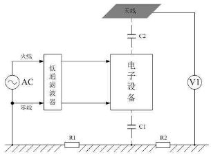 輻射干擾一般是通過電磁感應的形式在空間進行傳播的,圖4是測試電子設備產生輻射干擾的基本方法,或表示電子設備產生的干擾信號通過電磁感應向空中輻射的原理。圖4中,電子設備表示干擾信號源,V1表示測量儀表,C1表示電子設備對大地的電容,C2表示電子設備與天線偶合的電容,即:電子設備通過電場對天線產生感應,這里的天線也可以看成是被干擾的設備。圖4的測試方法就是測試電子設備周圍規(guī)定距離某處的電磁場強度,由于干擾信號一般都是一個頻率成份非常豐富的非正弦波,因此,無法對它進行直接測量,只能對它其中某一個頻率信號單獨進行測量。