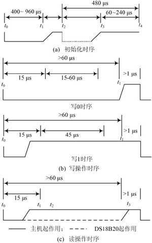 (1)初始化時序。時序見圖2(a),主機總線t0時刻發送一復位脈沖(最短為480s的低電平信號)接著在t1時刻釋放總線并進入接收狀態,DS18B20在檢測到總線的上升沿之后等待15~60μs,接著DS18B20在t2時刻發出存在脈沖(低電平持續60~240s),如圖中虛線所示。