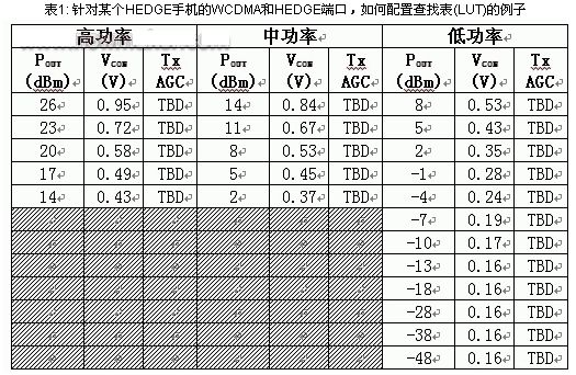 表1所示為針對某個HEDGE手機的WCDMA和HEDGE端口,如何配置查找表(LUT)的例子。該表格針對Avago的3G功率放大器,分為高、中和低功率模式三個主要部分。其它功率放大器因結(jié)構(gòu)不同而具有不同的設置。高、中和低功率模式分區(qū)下各列內(nèi)容為該模式下的輸出功率及其相應的VCON 電壓,這些電壓是基帶處理器生成的電壓,通知FAN5904為功率放大器提供正確的輸出電壓,獲得特定的輸出功率。GSM和EDGE則需要不同的查找表。