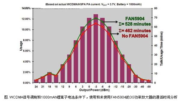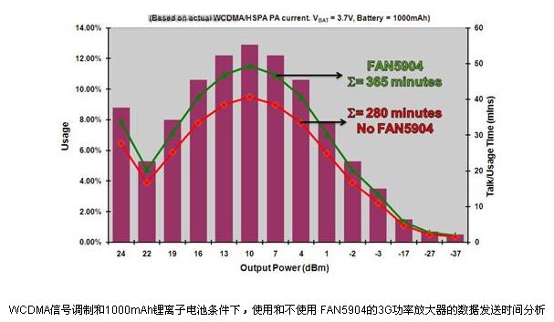 圖1和圖2顯示了在不同輸出功率條件下一個3G PA分別在語音和數(shù)據(jù)傳輸模式下有、無FAN5904時所使用的工作時間的分析。在PA電源電壓設定在鄰近信道功率比(ACPR)為-39dBc時的值時, WCDMA的ACPR可以改善到-43dBc,但是電流消耗將會增加,導致效率降低。