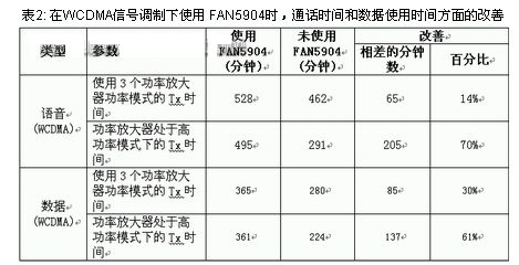 表2顯示了圖1和圖2的結(jié)果,以及功率放大器只工作于高功率模式下相應的分鐘數(shù)。在HSUPA、CDMA200 1x EV-DO和TD-SCDMA等不同信號調(diào)制模式下,電流消耗和通話時間都有類似的改善。這里把高功率模式工作的通話/數(shù)據(jù)使用時間一起顯示的原因是:新技術不僅得到了更多的分鐘數(shù),從設計角度來看,亦簡化了校準工作。當功率放大器具有多種功率模式時,固件必需適應何時從一個等級切換到下一個等級,因為在整個輸出功率范圍內(nèi),每個功率放大器的每種功率模式都存在獨特的VPA-POUT 曲線。由于現(xiàn)在大多數(shù)手機都支持至少三個頻段,這意味著滿足要求的系統(tǒng)中可能有三種3G功率放大器,所以增加了復雜程度。在處于一種功率模式的功率放大器中使用FAN5904,可以消除模式切換帶來的復雜性,更快地進行功率放大器校準,因為需要的校準點較少。這樣就縮短了測試/校準的時間,并且降低了制造成本,同時簡化了設計過程。