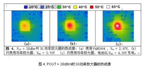 一個時常被忽視,但經(jīng)常遭到抱怨的參數(shù)是耗熱問題。在手持電話貼近頭部進行通話,使用手機網(wǎng)上沖浪或者玩在線網(wǎng)絡游戲時手機發(fā)熱,大多數(shù)用戶會因此而感到煩惱。問題的關鍵在于,設計人員在設計手機時必需將這一因素考慮在內(nèi)。圖4所示為某3G功率放大器的熱成像,其中,(a)為使用FAN5904來供電;(b)為直接與電池連接;(c)為電池以4.2V電壓充電。使用FAN5904時,在滿輸出功率情況下,功率放大器的溫度幾乎不可能達到50?C,在(b)和(c)的情況下,溫度很容易達到50?C和65?C,使用一段時間后,手機會很快發(fā)熱。在數(shù)據(jù)卡應用中,尤其是3G USB調(diào)制解調(diào)器卡開始流行,熱耗散,或者說實現(xiàn)熱耗散最小化變得十分重要。USB卡不能像手機那樣有效地散熱,因為它的體積非常小。由于3G調(diào)制解調(diào)器主要用于數(shù)據(jù),功率放大器在大部分時間運行于“發(fā)熱”狀態(tài)。減少這種熱量的最有效方式是使用諸如FAN5904的降壓轉(zhuǎn)換器。