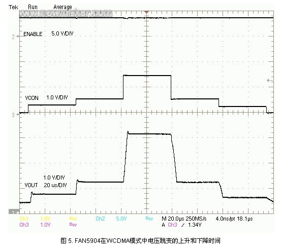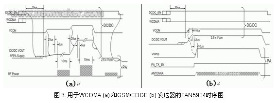 在輸出功率需要從低水平變到高水平,或者從啟動開始,瞬態(tài)響應時間為10?s。對于降壓穩(wěn)壓器而言,關鍵是使功率放大器滿足這些規(guī)范要求,避免出現(xiàn)通話中斷或者通話語音質(zhì)量不良的情況。由于用戶在不同的區(qū)域移動,信號覆蓋情況或好或壞,雖然如此,通話中斷現(xiàn)象是用戶所不能容忍的。對于GSM/EDGE模式,F(xiàn)AN5904能夠在5?s內(nèi)完成電壓之間的跳變,滿足GSM規(guī)范。圖6所示為用于WCDMA和GSM /EDGE發(fā)送器的FAN5904時序圖。