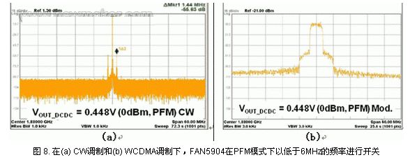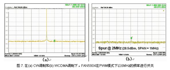 在使用降壓轉(zhuǎn)換器時,我們關心的是開關頻率如何影響RF性能,RF工程師極不愿意添加一個會對RF信號保真度(發(fā)送和接收兩個方面)造成潛在影響的器件。如前所述,F(xiàn)AN5904采用PWM或PFM模式工作,分析顯示,兩者均不會對RF性能造成影響。圖7(a)所示為28.5dBm信號的發(fā)送CW(關閉調(diào)制以顯示接近中心的尖刺),以及距右側(cè)6MHz的標記1。FAN5904產(chǎn)生的假性音調(diào)(spurious tones)水平很低,使得尖刺低于噪聲本底。圖7(b)所示為開啟調(diào)制時的尖刺水平。這種尖刺很小,遠遠低于Tx遮蔽水平。FAN5904具有6MHz 開關頻率的一個優(yōu)勢在于該頻率遠離信號頻率,并且位于5MHz的帶寬之外,轉(zhuǎn)換成位于WCDMA信號兩側(cè)的2.5MHz頻率。