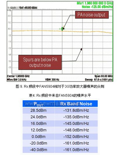 為了進一步了解降壓轉(zhuǎn)換器帶來的噪聲/尖刺情況,根據(jù)3G功率放大器自身的噪聲輸出,對接收頻段內(nèi)的噪聲進行了測量和比較。圖9顯示在28.5dBm的最高輸出功率下,來自FAN5904的尖刺水平實際上遠遠低于功率放大器的噪聲水平,表4顯示,來自FAN5904 的噪聲在-131.8dBm/Hz處最大,但仍然遠遠低于功率放大器自身的-90dBc。RF工程師可以放心,F(xiàn)AN5904在PWM和PFM模式工作時不會對蜂窩和其它RF頻譜的發(fā)送和接收頻段造成干擾。