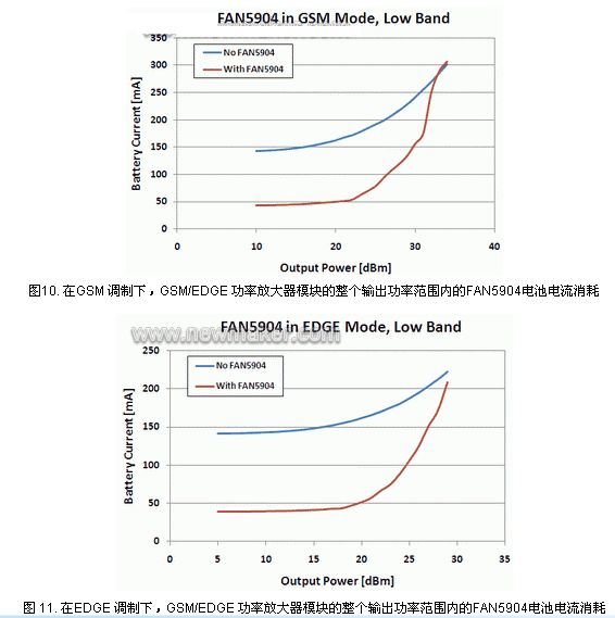 最后一個重要特性是,F(xiàn)AN5904控制GSM/EDGE功率放大器模塊的能力在于將RF功率管理解決方案從 FAN5904分離出來。在GSM/EDGE模式下,F(xiàn)AN5904具有3A的設計峰值極限電流,因而能夠控制電流高達2A的功率放大器模塊。在GSM /EDGE模式下,由于電流負載更大,F(xiàn)AN5904總是以PWM方式工作,因為GSM和EDGE信號較3G信號具有更高的輸出功率水平,因此它以 3MHz的頻率進行開關。3MHz是合適的開關頻率,因為它位于WCDMA通道帶寬之外,但是仍然可以使用小電感和小電容來處理更大電流負載,并使效率維持在高達95%的水平。人們可能要問,為什么在該模式下不使用6MHz,這在設計上是不可行的,因為較大的電流負載會使開關損耗更高,小型化解決方案帶來的好處在效率方面得不到補償。圖10和圖11顯示,在蜂窩設備處于GSM或EDGE模式下,使用FAN5904可將電流降低100mA。
